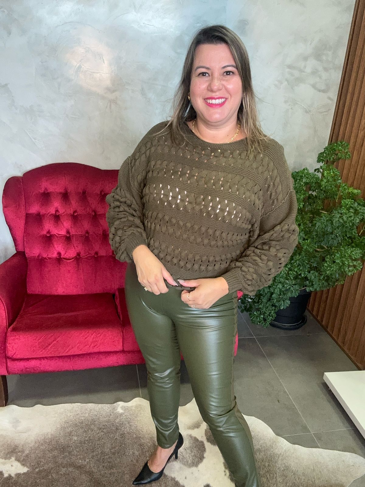 Calça confeccionada em microgorgurinho com couro fake na parte frontal e forro apeluciado. Toque levemente encorpado, macio e com bastante elasticidade. Shape ajustado no corpo com elástico na cintura, cós alto e parte frontal em courinho com forro apeluciado.